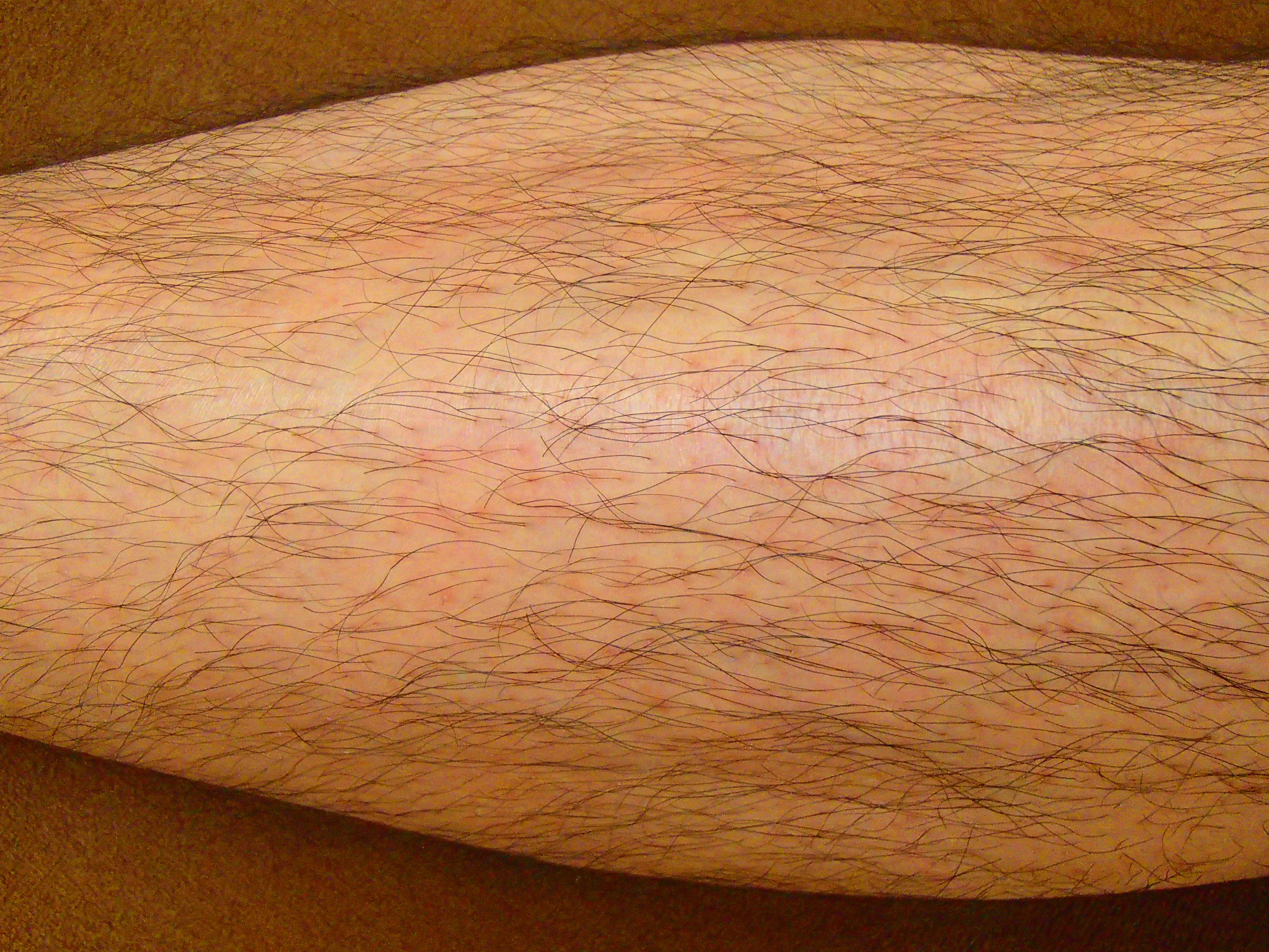 さらにもう一点ポイントとしては脱毛は1回では終わらないということです。なぜなら脱毛施術により作用させる事が出来るのは「成長期」の毛に対してのみであるためです。例えば以下のスネ毛の写真では1回の施術により80%以上成長期の毛(成長期は全体の毛量では10%未満です)を脱毛する事ができた症例とします。しかし皆さん勘違いされ易いのですが、こちらの足はまた1~2ヶ月後にはBeforeの状態のようになります。なぜなら休止期の毛が成長期となってくる為です。